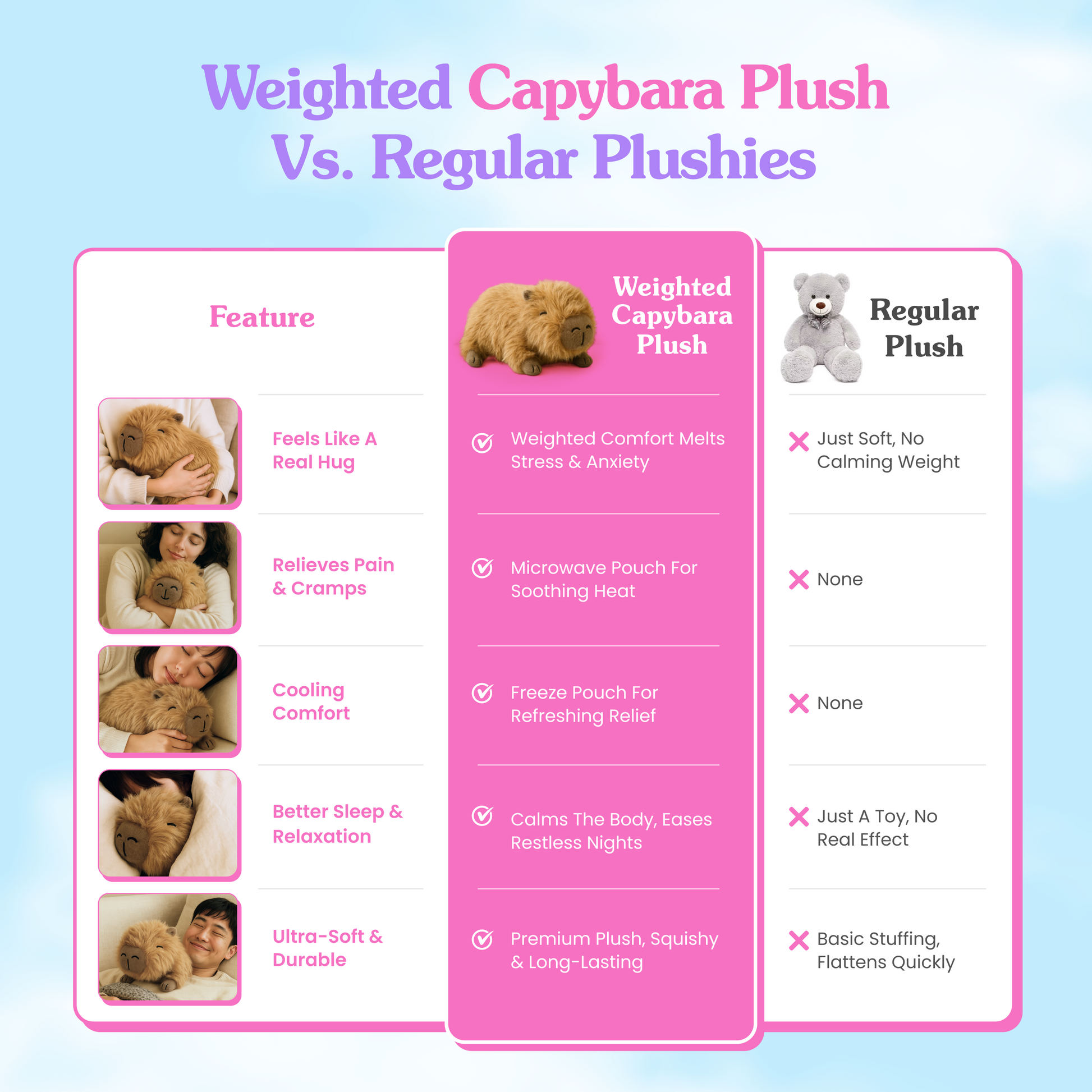 Experience the plush that hugs back. The Weighted Capybara is crafted for relaxation, balance, and peace of mind—so every cuddle feels like therapy wrapped in fluff.